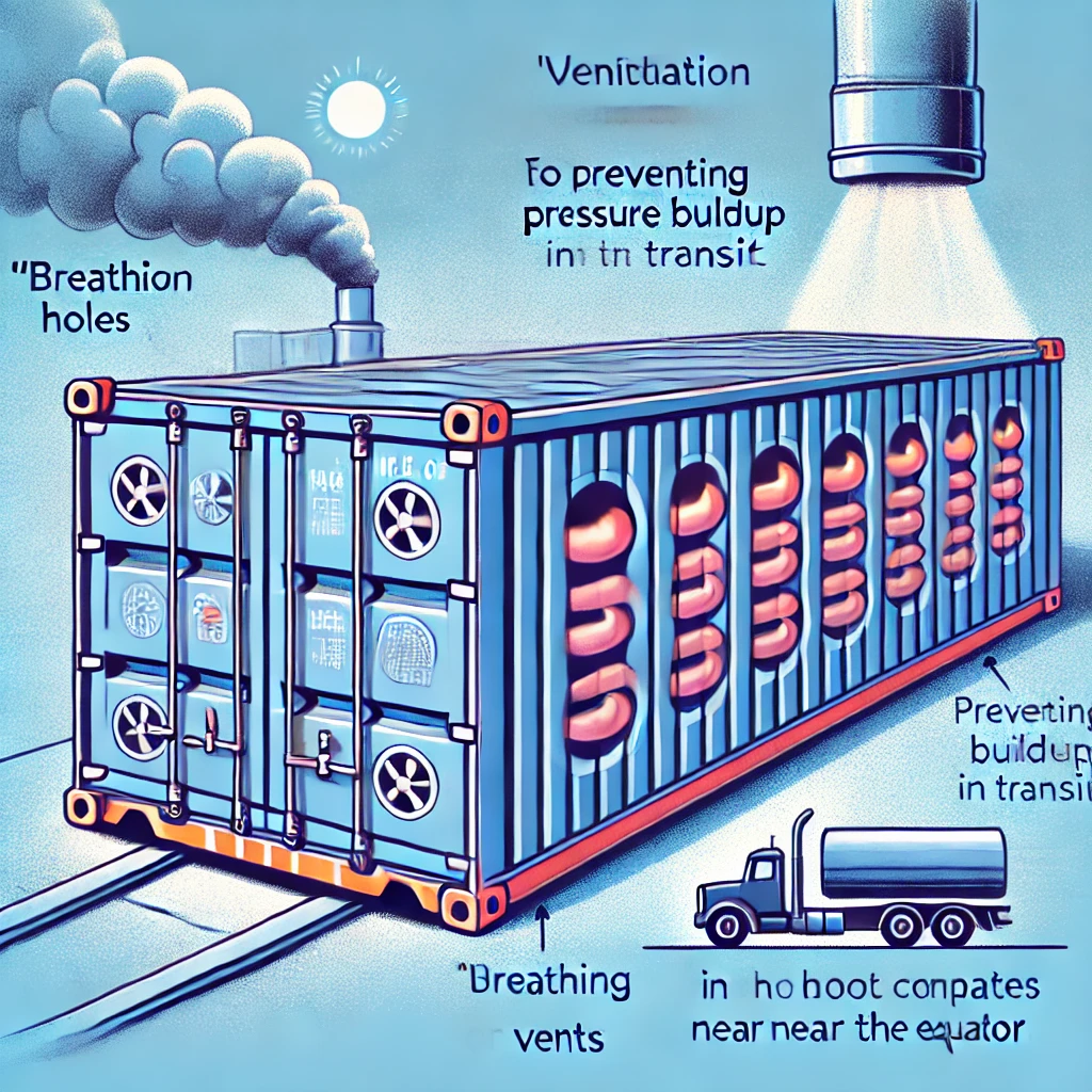 컨테이너 내부에 통기구가 없다면, 온도와 습도의 변화로 인해 수분과 공기가 팽창하게 되며, 이로 인해 폭발이나 변형의 위험이 발생할 수 있습니다. 이를 방지하기 위해 통기구를 통해 내부와 외부의 공기 압력 차이를 줄여주는 것입니다.