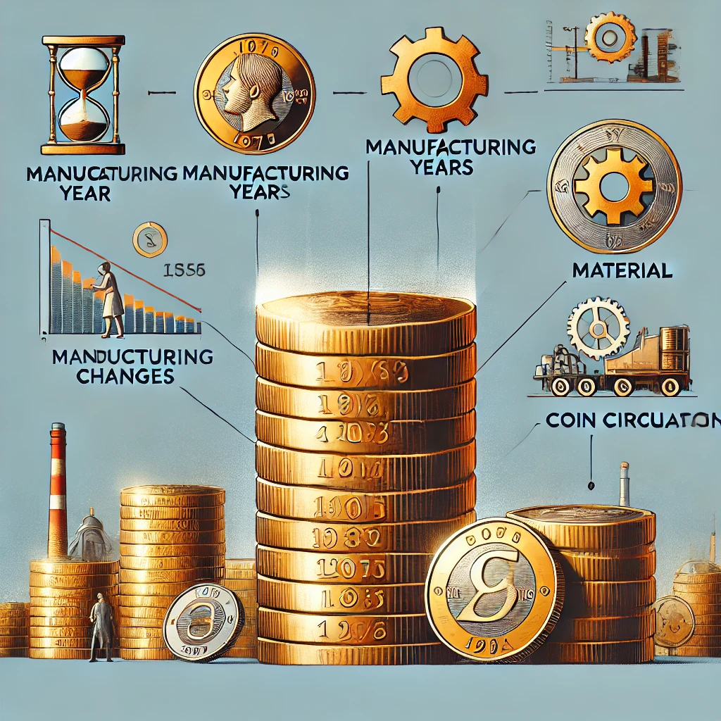 동전에는 제조 연도가 찍혀 있습니다. 이 제조 연도는 동전이 어떤 해에 생산되었는지를 나타내는 중요한 정보입니다. 특히 동전의 성분이나 디자인, 발행 시기와 관련이 있어, 이를 통해 동전의 변천사를 추적할 수 있습니다.